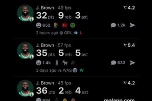 过去5场比赛,布朗四次砍下30+,赛季至今,他场均砍下28.1分。