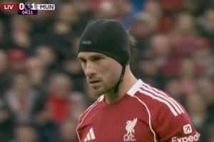 比赛刚开始姆伯莫破门,在进球前的争顶,范迪克争顶中肘击麦卡利斯特。之后麦卡接受治疗,头上戴上了帽子继续比赛。